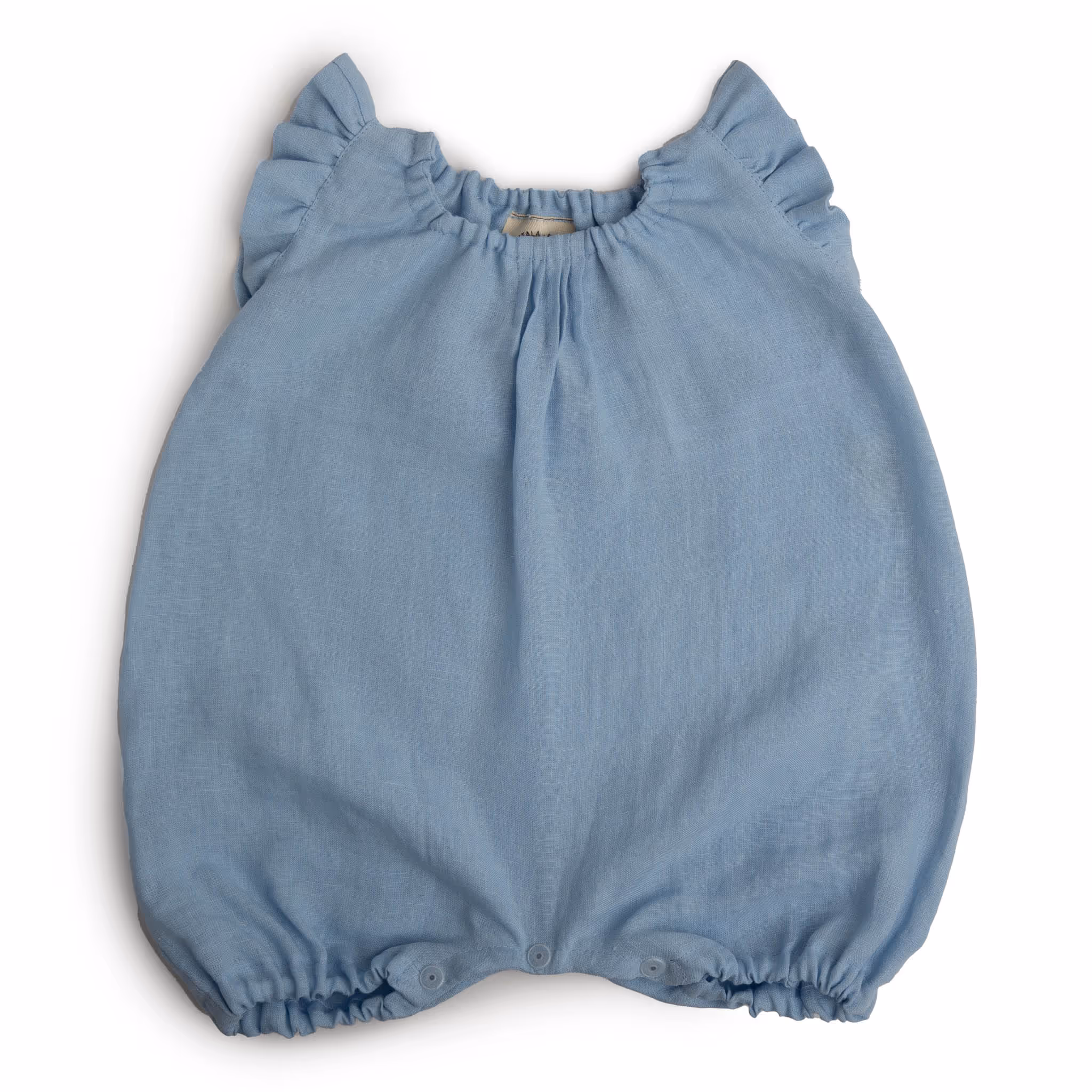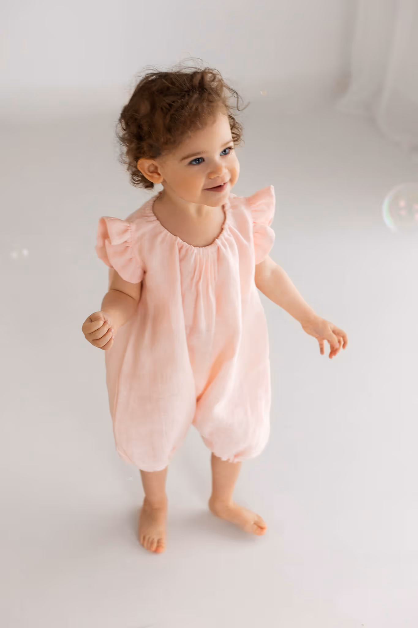 Jeho ľahkosť a voľnosť dodáva pocit najväčšej slobody. Romper je voľného strihu, bez rukávov. Ramienka zdobia volániky, okolo krku je okrúhly výstrih s voľnou, pružnou gumičkou. Zapínanie v rozkroku na patentové gombíky. Pri prebaľovaní bábätka stačí romper rozopnúť v plienkovej oblasti, nemusíte vyzliekať.